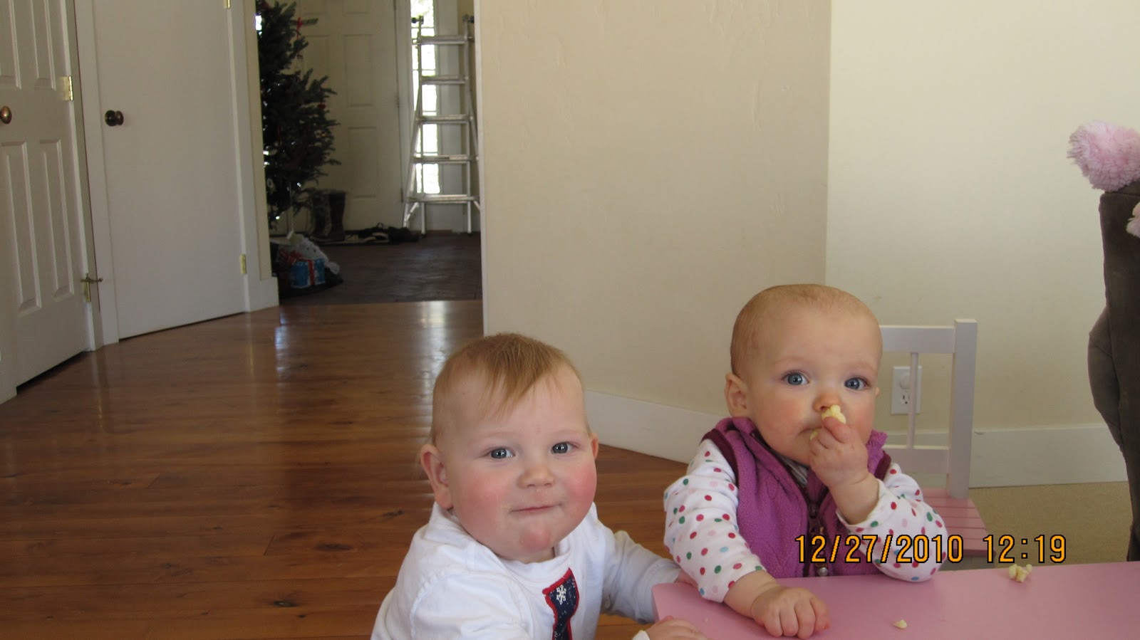 | A new trick: pulling Mommy's hair while she picks up the potato I dropped! |